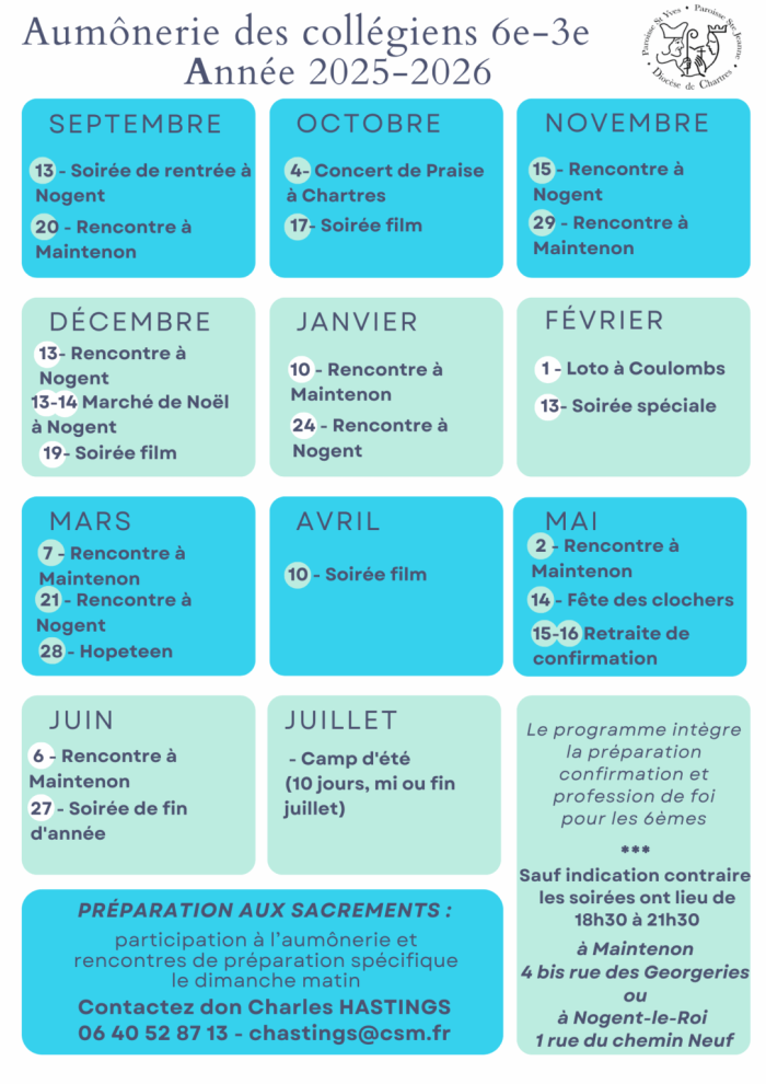 Comme l’an dernier, les 6e, qui préparent leur profession de foi et leur confirmation, se rassembleront en même temps que les autres collégiens, avec un enseignement à part. Les horaires ont été avancés pour mieux correspondre aux besoins des jeunes (18h30-21h30).