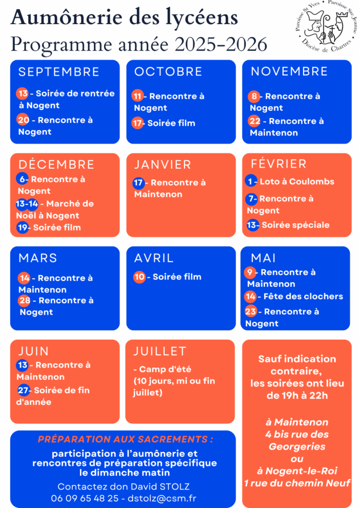 - La fiche d’autorisations, que vous recevrez par mail une fois le formulaire en ligne complété, est à imprimer, à signer et à déposer aux presbytères de Maintenon ou Nogent-le-Roi, ou bien à apporter à la prochaine rencontre (possibilité également de la renvoyer par mail : aumonerie.sjsy@diocesechartres.fr)
